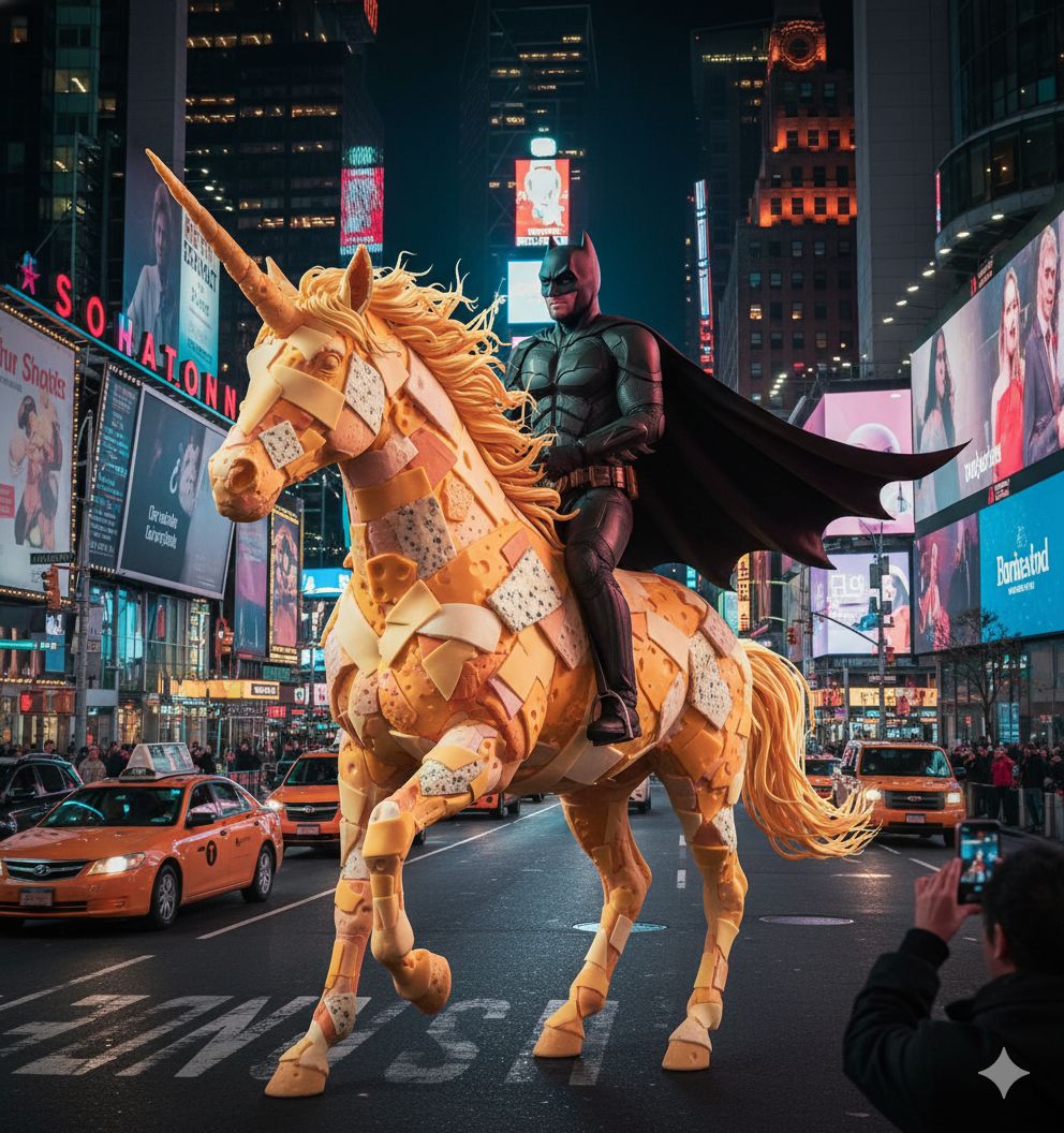 Can’t find an image you want? Use Nano Banana from Google. It can create anything you can imagine. Want to ride a unicorn made of cheese through Times Square dressed as Batman? Done! (scroll to the bottom 😉)